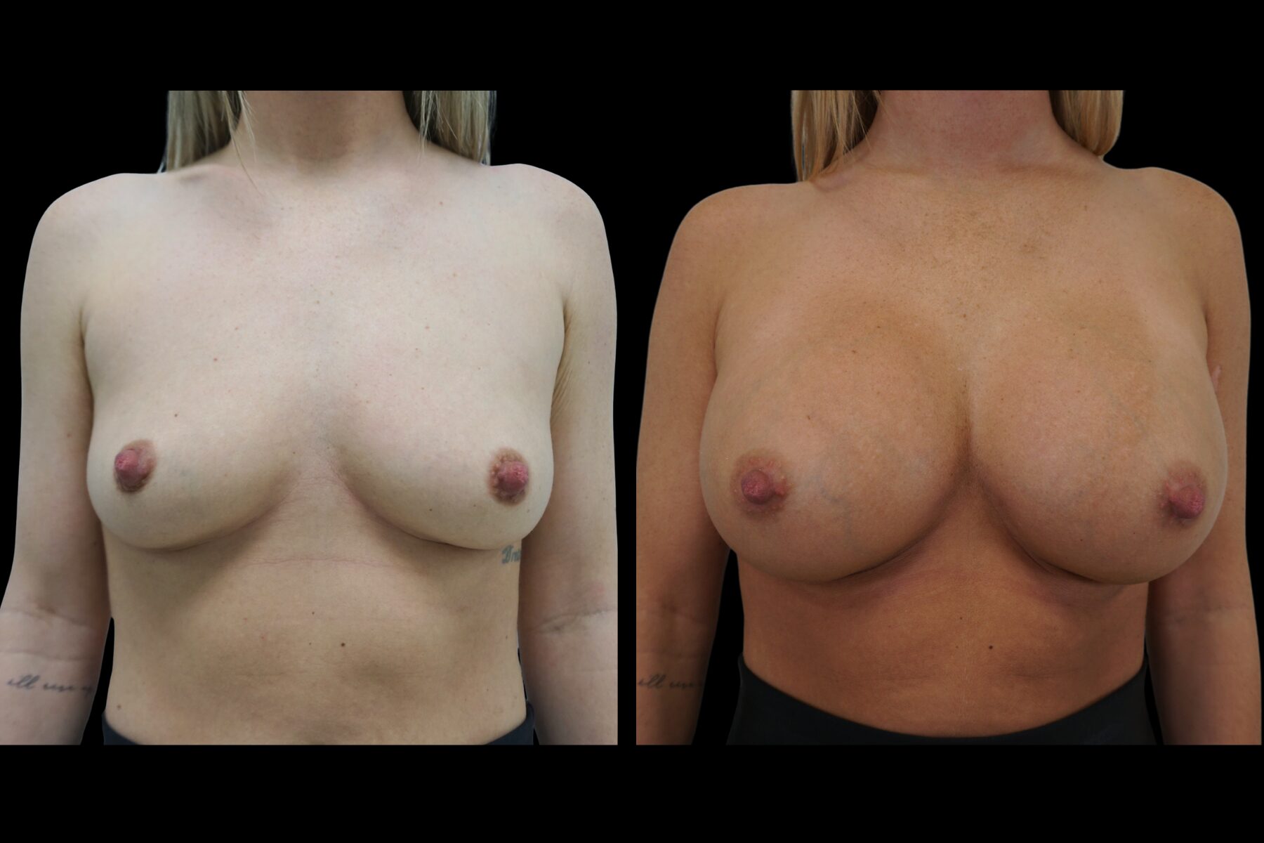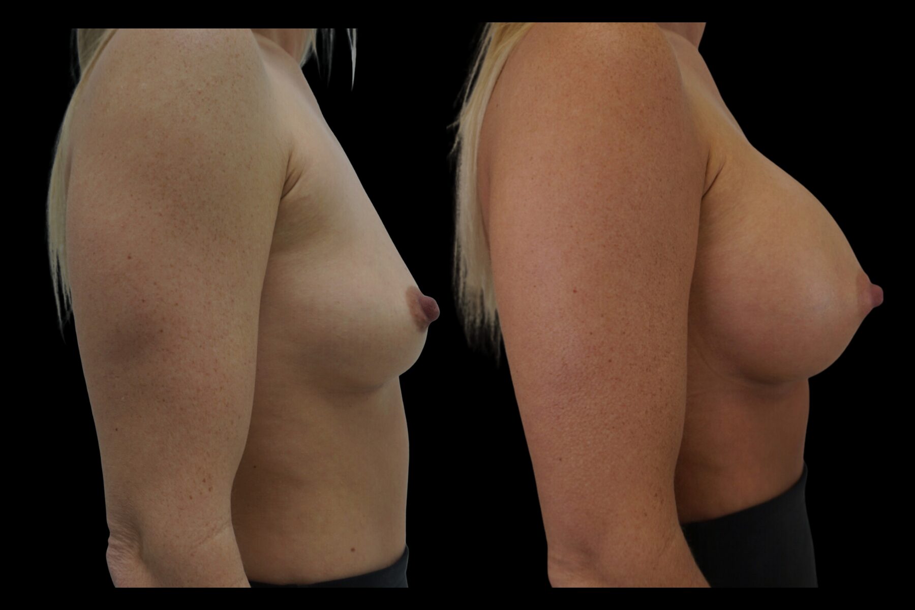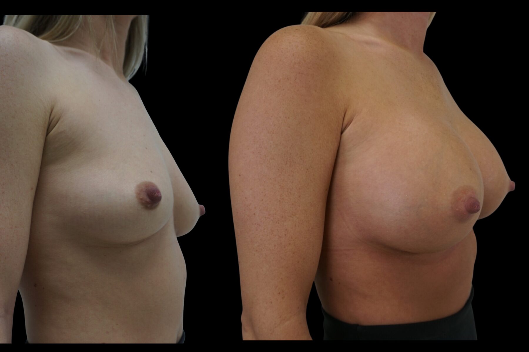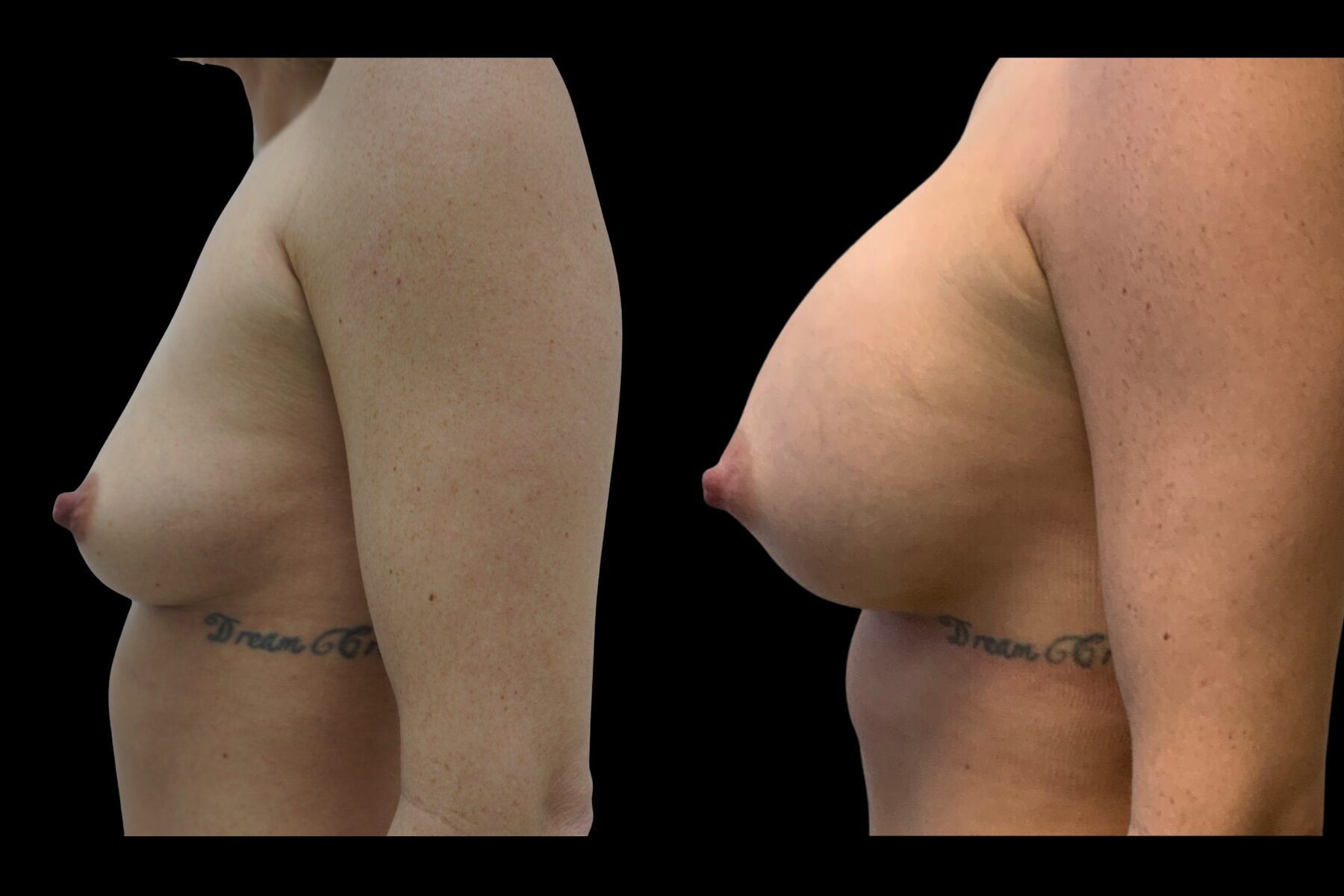 This patient is 5’5, and came to us as a 32A cup prior to surgery. 390 cc high profile silicone implants were placed under the muscle.